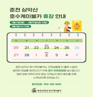 야간 개장을 위한 지주 비상조명 및 CCTV 설치 작업을 위해 2월 21일부터 25일까지 5일간 휴장하고 3월 2일도 하루 삼악산 호수케이블카는 문을 잠시 닫는다.