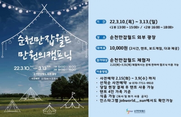 이번 이벤트는 2월 22일부터 3월말까지 잡월드 프로그램 체험자 및 체험예약자를 대상으로, 3월 10일부터 13일까지 순천만잡월드 야외광장에서 진행된다. 4인 가족이 1만원의 체험료로 2시간동안 텐트를 대여해 보드게임, 다과 등을 자유롭게 이용하면서 캠핑을 즐길 수 있다.