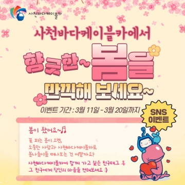 사천시시설관리공단(이사장 박태정)은 2022년 봄을 맞아 3월 11일부터 20일까지 ‘사천바다케이블카에서 향긋한 봄을 만끽해 보세요~’ SNS 이벤트를 진행한다.