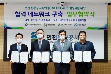 인천관광공사는 23일 공사 디지털회의실에서 인천광역시교육청, 인천환경공단, 수도권매립지관리공사와 ‘인천 친환경 교육여행(Eco-Edu Tour)’을 활성화하기 위한 다자간 업무협약을 체결했다.