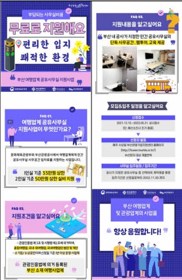 부산관광공사(사장: 이정실, 이하 공사)는 문화체육관광부, 부산광역시와 함께 코로나19 장기화로 경영난을 겪고 있는 부산 여행사들을 대상으로 운영 중인 여행업계 공유사무실 공간 지원사업을 기존 6월 말 종료에서 5개월 연장하여 11월 30일까지 지원한다고 밝혔다.
