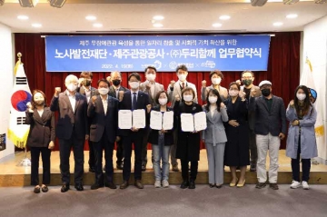제주관광공사(사장 고은숙)는 19일 11시 제주웰컴센터에서 노사발전재단(사무총장 정형우), ㈜두리함께(대표 이은실)와 「제주 무장애 관광 육성을 통한 일자리 창출 및 사회적 가치확산을 위한 업무협약」을 체결했다.