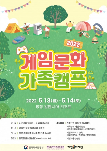 게임문화재단이 문화체육관광부, 한국콘텐츠진흥원과 건전한 게임문화 확산을 위해 가족 참여형 프로그램인 ‘2022 게임문화 가족캠프(이하 캠프)’를 운영한다.