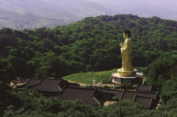 절 마당에는 40m에 달하는 황동약사여래입상이 푸른 하늘을 배경으로 의연하게 서서 특유의 아우라를 자아낸다.