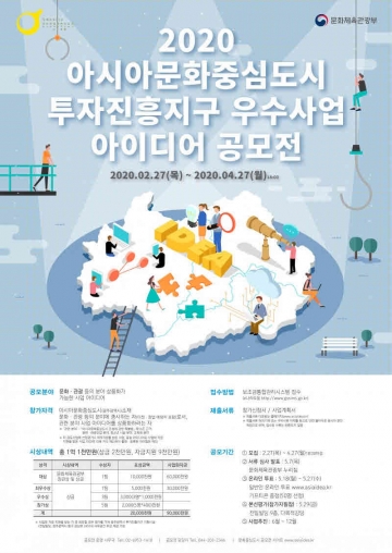 문화체육관광부 아시아문화중심도시추진단(이하 아문단)이 주최/주관하는 ‘2020 아시아문화중심도시 투자진흥지구 우수사업 아이디어 공모전’이 개최된다.