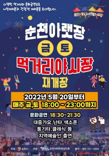 순천시는 코로나19 확산방지를 위해 잠정 중단했던 아랫장 야시장을 코로나19 방역지침 완화에 따라 오는 20일에 재개장한다.
