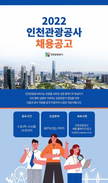 접수기간은 6월 6일 월요일 18:00까지이며 온라인으로 접수 가능하다. 자세한 응시방법은 인천관광공사 채용 홈페이지(ito2022.saramin.co.kr)를 참조하면 된다.