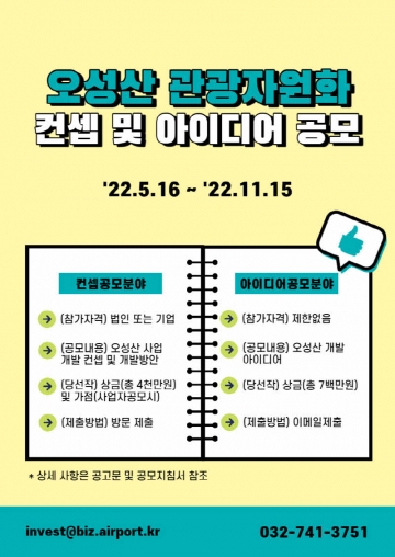 ‘아이디어 공모’의 경우 오성산에 도입 가능한 시설‧콘텐츠 및 관광객 집객 아이디어를 주제로 별도 참가자격 제한 없이 개인 또는 단체가 자유롭게 응모 가능하다.
