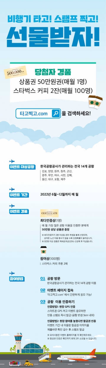 이번 이벤트는 전국공항에서 운항하는 국내·국제선을 편도 1회 이상 이용 후 이벤트 페이지(타고찍고.com)에 접속해 'GPS 인증하기' 또는 '항공권 인증하기'로 응모할 수 있다.