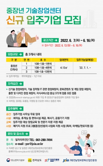 전남정보문화산업진흥원(원장 이인용, 이하 ‘진흥원’)이 ‘중장년 기술창업센터’ 신규 입주기업을 16일까지 모집한다고 밝혔다.