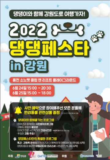 강원도는 24일(금), 25일(토) 이틀간 홍천 소노펫 비발디파크에서 반려동물 동반 관광 활성화를 위하여 ‘2022 댕댕페스타 in 강원’을 개최한다.