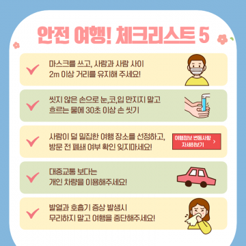 문화체육관광부(장관 박양우)와 한국관광공사(사장 안영배)는 코로나19로 인해 사회적 거리두기가 요구되는 가운데, 황금연휴 기간 여행을 떠나는 사람들을 대상으로 참고해야 할 ‘여행 경로별 행동 요령’ 홍보에 나섰다.