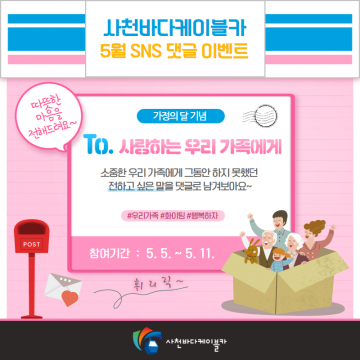 사천시시설관리공단(이사장 박태정)은 5월을 맞아 사천바다케이블카를 널리 알리기 위해 전 국민 누구나 참여 가능한 SNS 댓글 이벤트를 진행한다.