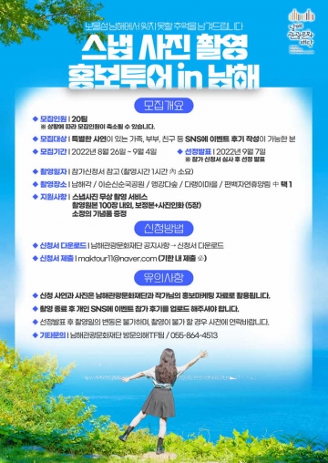 ‘스냅사진 홍보투어’는 2022 남해군 방문의 해를 맞이해 남해에서 잊지 못할 추억을 사진으로 제공하기 위해 추진된다. 남해각, 앵강다숲, 이순신순국공원 등 남해 대표 관광지에서 전문 사진작가가 촬영을 진행한다.