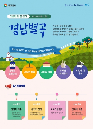 경상남도(도지사 김경수)는 도내에서 생활하며 여행하는 장기체류 여행 프로젝트 경남형 한 달 살이 ‘경남별곡(慶南別曲)’ 참가자를 14일부터 모집한다.