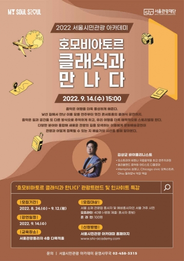 오는 14일 오후 3시 서울관광플라자에서 개최되는 ‘관광트렌드 특강’에서는 김상균 바이올리니스트를 초청해 클래식과 관광산업이 함께 나아갈 방향을 제시한다. 해당 강좌는 지난 6월부터 매달 ▲트렌드, ▲팬데믹 대응, ▲콘텐츠, ▲클래식, ▲스마트시티, ▲메타버스까지 다양한 분야의 주제를 다루고 있으며, 11월까지 온/오프라인으로 진행된다.