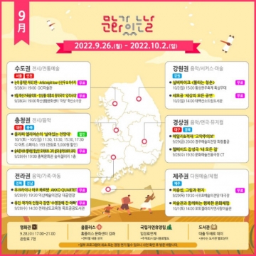 문화체육관광부(장관 박보균)와 지역문화진흥원(원장 차재근)은 9월 ‘문화가 있는 날’ 주간(9.26~10.2)에 국민들이 일상에서 더욱 쉽게 문화를 접할 수 있도록 다양한 문화 혜택을 제공한다.