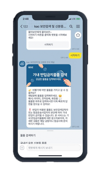 한국공항공사(사장 손창완)는 5월 18일부터 항공교통 이용 승객의 소지물품이 비행기에 반입할 수 있는 물품인지 아닌지를 직접 확인할 수 있는 ‘물어보안’ 카카오톡 챗봇 서비스를 운영한다.