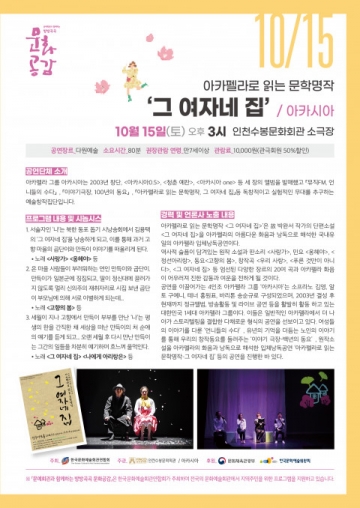 인천광역시가 인천예총에 위탁한 인천수봉문화회관은 이번 2022년 기획공연의 마지막 공연으로 ‘2022 문예회관과 함께하는 방방곡곡 문화공감사업’에 선정된 ‘그 여자네 집’을 10월 15일 토요일 오후 3시 인천수봉문화회관 소극장에서 진행한다.