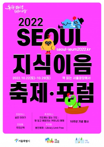 서울시는 10월 22일(토)부터 29일(토)까지 8일간 서울도서관과 서울광장, 축제 공식 누리집을 통해 온·오프라인으로 ‘2022 서울지식이음축제·포럼’을 진행한다.