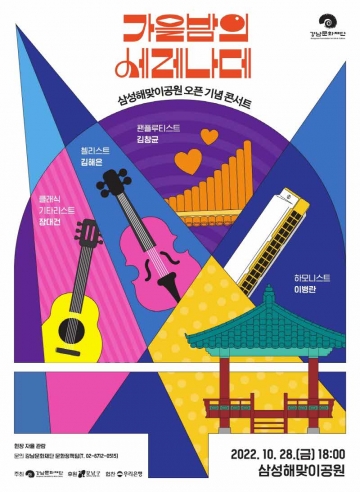 ‘꿈이 모이는 도시, 미래를 그리는 강남’으로 도약하는 강남구(구청장 조성명)가 28일 저녁 6시에 삼성해맞이공원에서 야외 음악회 ‘가을밤의 세레나데’를 개최한다.