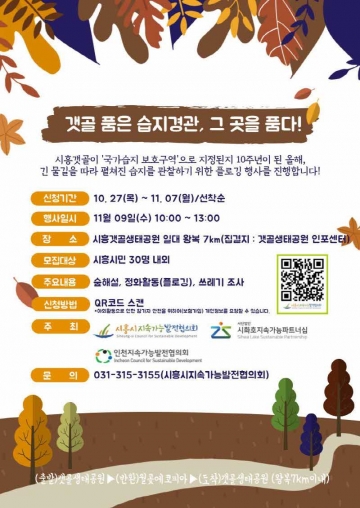 시흥시지속가능발전협의회(공동대표 임병택, 송미희, 이수용 이하 시흥시지속협)는 시화호지속가능파트너십, 인천지속가능발전협의회와 공동 주최로 오는 11월 9일 갯골생태공원 일대를 플로깅하는 ‘갯골 품은 습지 경관, 그 곳을 품다!’ 캠페인을 개최한다.