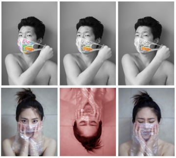 마스크를 쓰고 있는 남자와 여자의 모습, 입을 막고 있는 마스크 위에 텍스트로 메시지를 던진다. 그녀의 작품들에서 바이러스의 의존성과 인간이 느끼는 적대성의 양면적 연결고리는 다각적 측면의 감성들을 불러일으킨다.