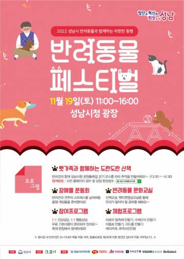 성남시는 오는 11월 19일 오전 11시~오후 4시 시청 광장에서 ‘2022. 반려동물 페스티벌’을 개최한다.