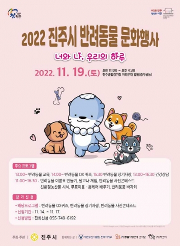 진주시는 오는 19일 오전 11시부터 오후 4시 30분까지 진주종합경기장 야외무대 일원에서‘2022 진주시 반려동물 문화행사’를 개최한다.
