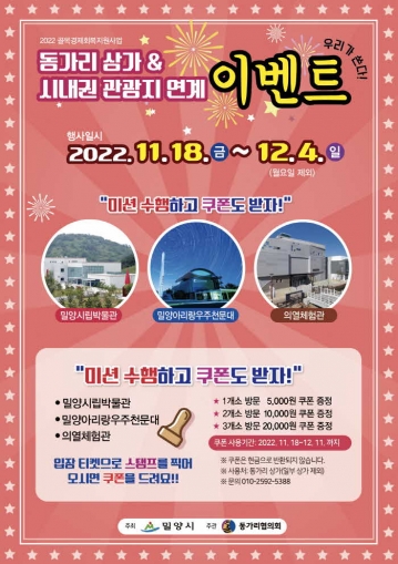 동가리협의회(회장 장봉헌) 주관으로 실시되는 이번 이벤트는 밀양 시내권 대표 관광지인 의열체험관, 밀양아리랑우주천문대, 밀양시립박물관을 방문하는 관광객들에게 1곳 방문 시 5,000원, 2곳 방문 시 1만원, 3곳 방문 시 2만원의 동가리 상가 일대 사용 쿠폰을 제공한다.