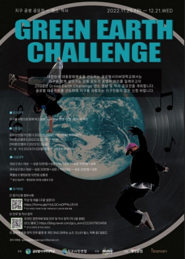 글로벌사이버대학교가 11월 25일 그린어스챌린지 공모전이 시작됐다고 밝혔다. 이는 지구와 함께 살아가는 인류 모두가 공생의 의미를 되새겨 보자는 취지의 문화 행사로 제시된 음악에 어울리는 댄스와 작사를 공모하는 창작 챌린지로 글로벌사이버대학교에서 진행 중인 지구힐링 365캠페인의 일환으로 개최되고 있다.