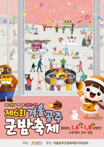 6회째를 맞는 겨울공주 군밤축제는 ‘공주 알밤과 떠나는 달콤한 여행’을 주제로 1월 6일부터 8일까지 공주 아트센터 고마 일원에서 펼쳐진다.
