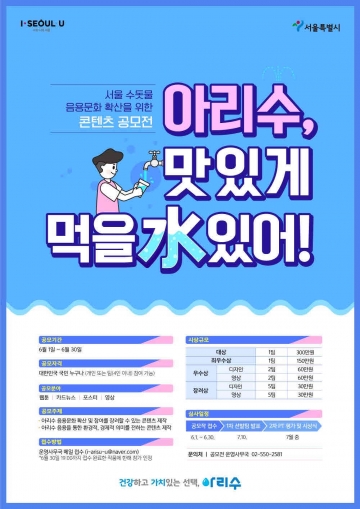서울시는 서울의 수돗물 ‘아리수’의 우수성을 홍보하고, 수돗물의 음용문화를 확산하기 위한 영상․디자인 콘텐츠 공모전을 개최한다.