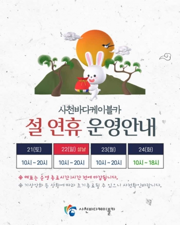 사천시시설관리공단(이사장 박태정)은 2023년 설날을 맞아 시민들과 귀성객의 편의를 위해 사천바다케이블카를 정상 운영한다고 밝혔다.