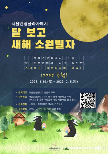서울관광재단(대표이사 길기연)은 설 명절과 정월대보름을 맞아 1월 19일부터 2월 5일까지 ‘서울관광플라자에서 달 보고 새해 소원빌자’ 이벤트를 운영한다고 밝혔다.