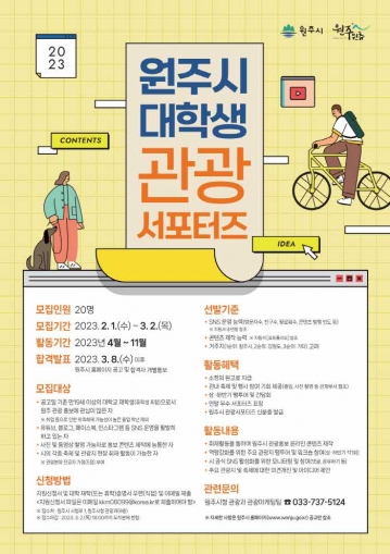원주시가 2023년 원주지역 관광자원 홍보에 참여할 대학생 관광서포터즈를 모집한다.