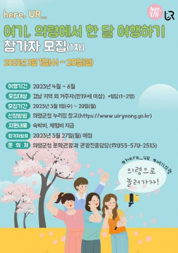의령군(군수 오태완)이 올해 ‘here, UR 여기, 의령에서 한 달 여행하기’ 사업 1차 참가자를 모집한다.