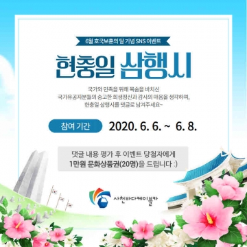 먼저, 6월 6일부터 8일까지 3일간 ‘<호국보훈의 달 기념> 현충일 삼행시’ 이벤트를 실시한다. 참여방법은 페이스북 또는 인스타그램 공식 계정을 팔로워한 뒤 이벤트 게시물에 국가를 위해 희생하신 분들께 감사의 마음을 담아 ‘현충일’ 삼행시를 지어 댓글로 남기면 된다. 댓글 내용과 기타 준수사항을 평가한 후 10,000원 상당의 문화상품권을 20명에게 제공한다.