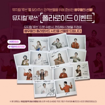 이밖에도 뮤지컬 <루쓰>는 성공적인 개막을 기념하며 관객들을 대상으로 다양한 이벤트를 마련했다. 관람후기 이벤트, 화이트데이 커플 이벤트, 폴라로이드 증정 이벤트, 사인회 등 예비 관객, 관람 관객, 재관람 관객 모두가 참여할 수 있도록 폭넓은 이벤트가 준비되어 있으며, 이벤트의 자세한 내용은 각 예매처에서 확인이 가능하다.