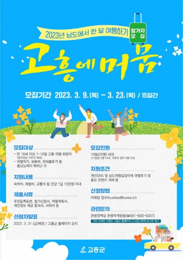 고흥군(군수 공영민)은 체류여행 프로젝트인 2023 남도에서 한 달 여행하기 ‘고흥에 머뭄’ 참가자를 모집한다고 밝혔다.