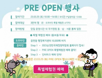 2023순천만국제정원박람회(이하 박람회)를 사전에 체험할 수 있는 프레오픈(pre open) 행사가 오는 25일 10시부터 14시까지 박람회장 전역에 걸쳐 열린다.
