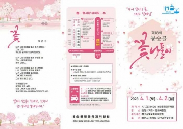 봉숫골벚꽃축제위원회(위원장 임병철)에서는 2023년 4월 1일부터 2일까지 양일간 4년 만의 ‘제18회 봉숫골 꽃나들이 축제’를 봉숫골 아름다운 거리 일원에서 개최한다고 밝혔다.