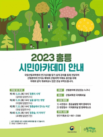 산림청 국립산림과학원(원장 배재수)은 3월 25일(토) 14시 일반 국민에게 산림과학을 쉽고 친근하게 전달하기 위한 ‘홍릉 시민 아카데미’를 개최한다고 밝혔다.