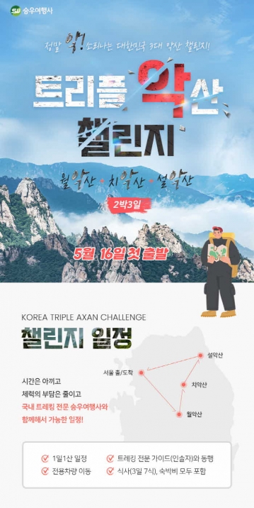 승우여행사가 대한민국에서 가장 험하다고 알려진 3대 악산에 오르는 ‘트리플 악산 챌린지’ 여행을 선보이고, 올 5월 첫 도전에 함께할 1기 도전자를 모집한다.