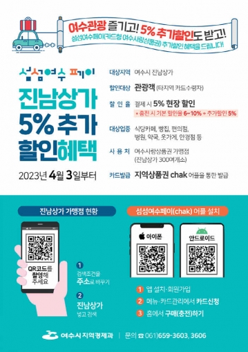 이번 할인은 타 지역에서 카드를 수령한 관광객이 진남상가 내 여수사랑상품권 가맹점에서 ‘섬섬여수페이’로 결제하면 월 최대 25000원까지 결제금액의 5% 현장할인을 받을 수 있다.