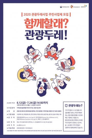 문화체육관광부(장관 박양우, 이하 문체부)는 지역 관광을 지속적으로 활성화하기 위해 한국관광공사(사장 안영배, 이하 관광공사)와 함께 6월 12일(금)부터 7월 24일(금)까지 ‘2020년 관광두레’ 신규 주민사업체를 모집한다.