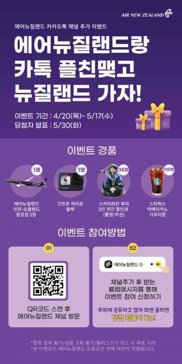 에어뉴질랜드는 공식 카카오톡 채널을 통해 총 140명에게 뉴질랜드 왕복 항공권 등 푸짐한 경품을 증정하는 ‘에어뉴질랜드 카카오톡 채널 추가 이벤트’를 진행한다. 뉴질랜드 항공권 할인은 물론 다양한 뉴질랜드 여행 정보 및 에어뉴질랜드의 최신 업데이트 소식을 더 많은 소비자에게 전달하기 위해 기획된 이번 이벤트는 4월 20일부터 5월 17일까지 참여할 수 있다.
