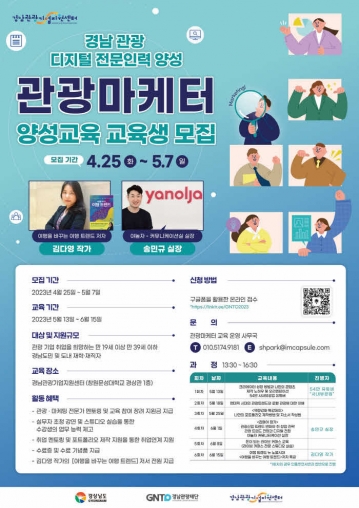 교육 신청은 구글 폼(https://linktr.ee/GNTO2023)을 통해 신청할 수 있으며, 보다 자세한 사항은 경남관광기업지원센터 누리집(https://gyeongnam.tourbiz.or.kr/)을 참고하면 된다.