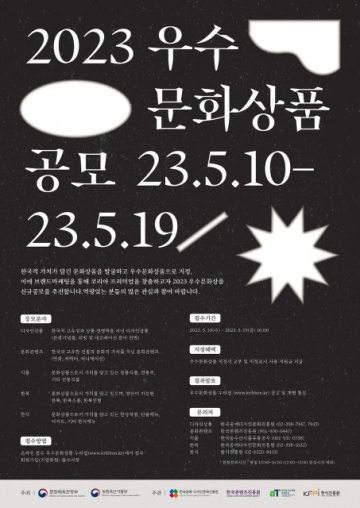 문화체육관광부(장관 박보균, 이하 문체부)는 농림축산식품부(장관 정황근, 이하 농식품부)와 함께 ‘2023 우수문화상품 공모’ 접수를 오는 5월 10일(수)부터 19일(금)까지 우수문화상품 누리집에서 진행한다.