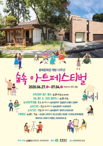 충북도와 충북문화재단이 충북문화관(구 도지사관사) 개방 10주년을 맞아 6월 27일부터 7월 4일까지 문화관 일원에서 도민들과 지역예술인들이 함께하는 ‘숲속 아트 페스티벌’을 개최한다.